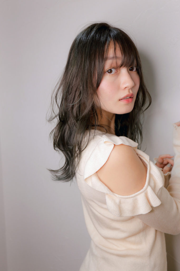 やや前下がりにカットした切りっぱなしスタイルあえてカットラインを残す事で毛先に厚みがでてオシャレ度UPカラーは全体にハイライトを入れて、グレージュカラーに!